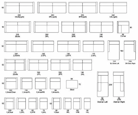 Sohvasta voi rakentaa vaikka minkälaisia kokonaisuuksia yhdistämällä eri osia, katso moduulikartta.